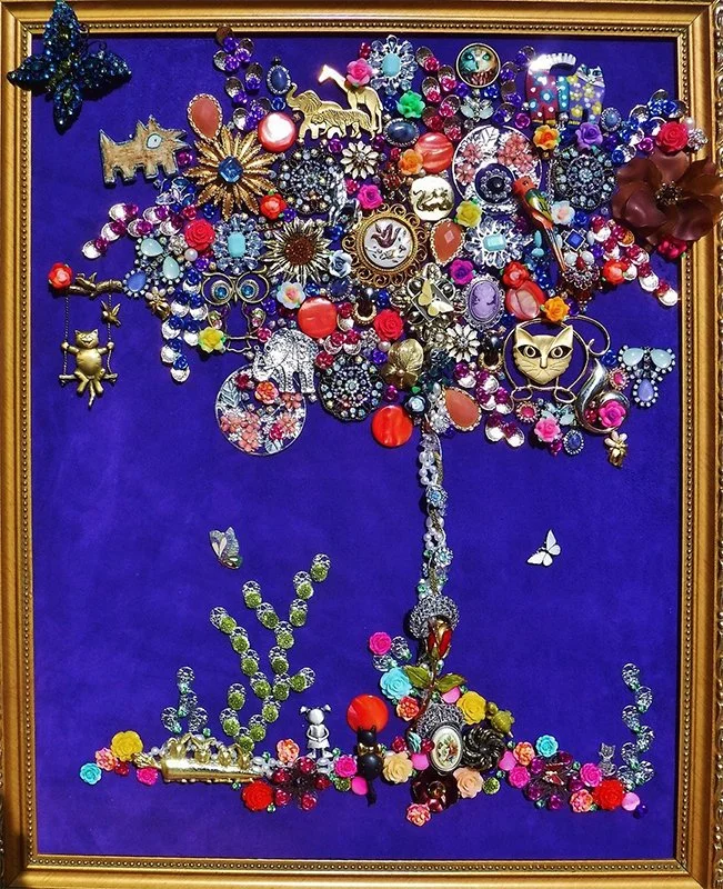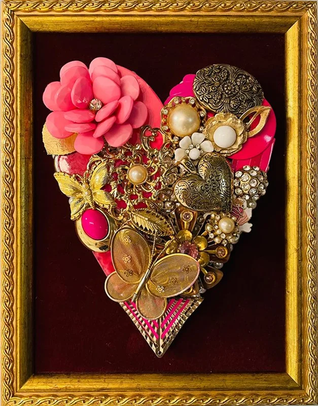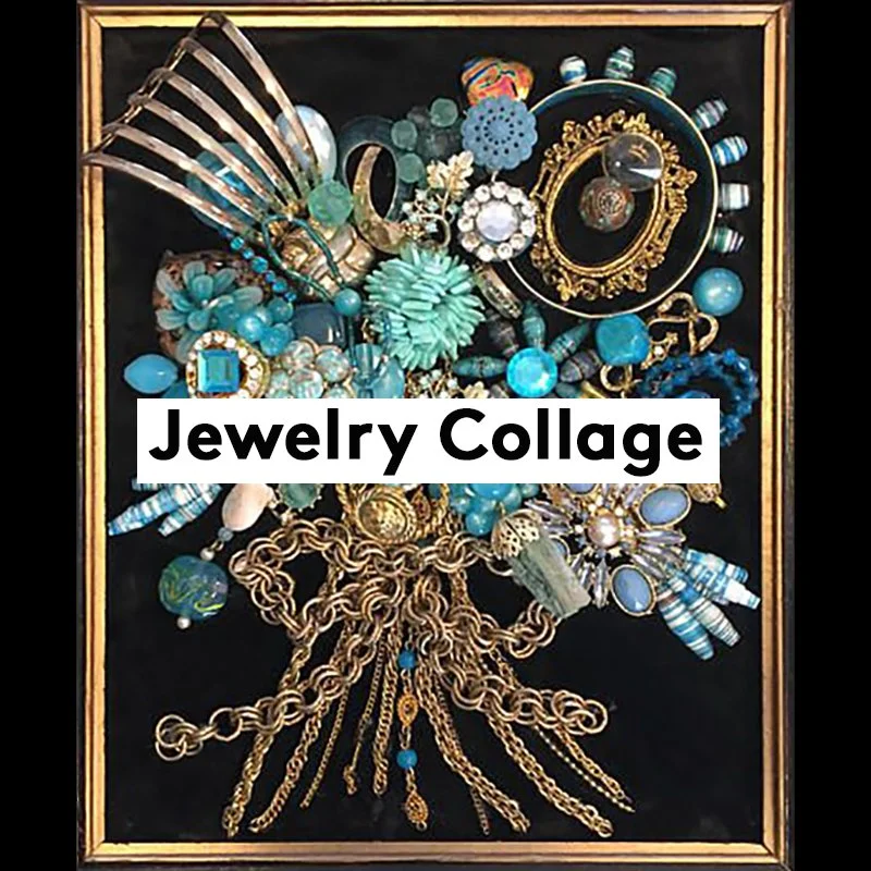 Description: Using a vast array of vintage and broken jewelry supplied by Remainders, students will make their own jewelry collage mounted on a firm, fabric covered backing to frame and display in your home or give as a gift. Many shapes and designs like bouquets, hearts, holiday trees, initials and more will be explored. You will be encouraged to follow you own creative expression, and get inspired by the many ideas available.
